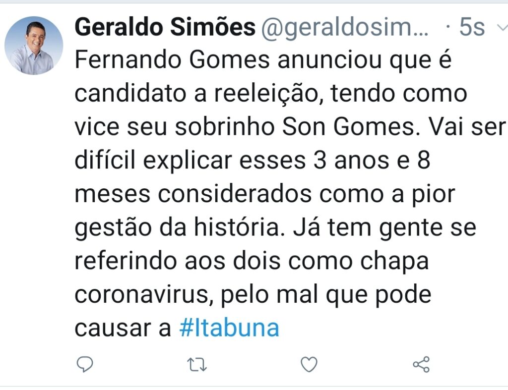 Após o anúncio do prefeito Fernando Gomes decidir pela reeleição, o ex-prefeito Geraldo Simões alfinetou o adversário.