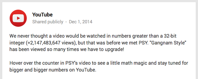 Quem acessar o vídeo de Gangnam Style direto no Youtube e passar o mouse em cima do número de visualizações vai encontrar um easter egg: os números começam a girar como em uma máquina de cassino, e ficam negativos. Isso é o que aconteceria se o algoritmo não fosse atualizado.