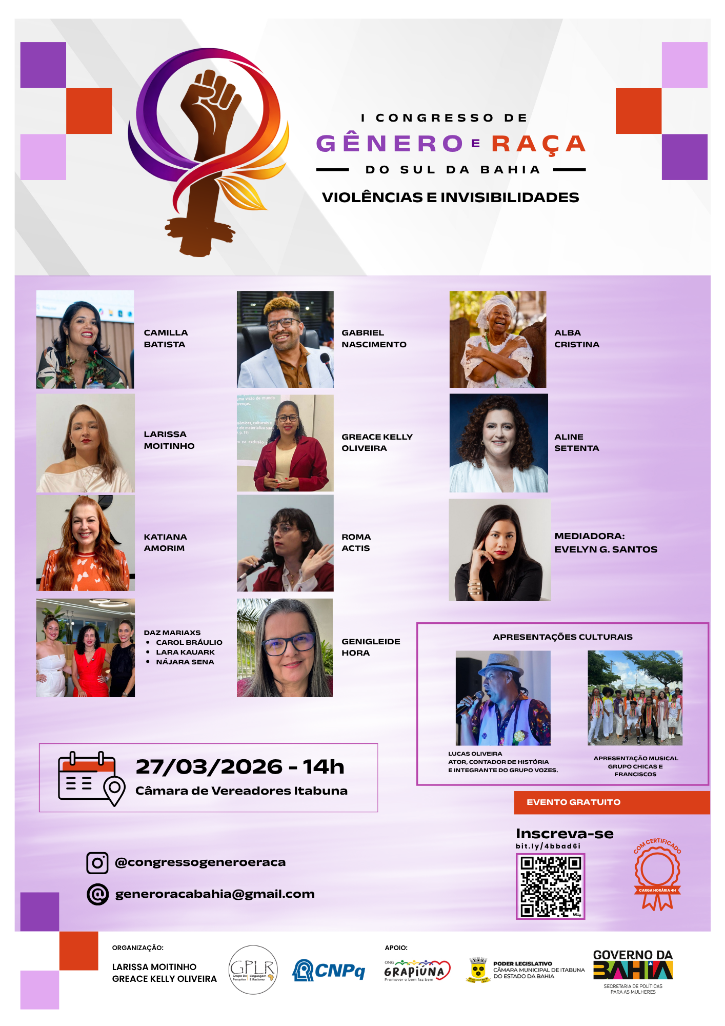Organizado por Larissa Moitinho e Greace Kelly Oliveira, o congresso conta com apoio do Grupo de Pesquisa em Linguagem e Racismo (GPLR) – CNPq, liderado pelo Dr. Gabriel Nascimento, da ONG Grapiúna, da Câmara de Vereadores de Itabuna e do Governo do Estado da Bahia, por meio da Secretaria de Políticas para as Mulheres.
