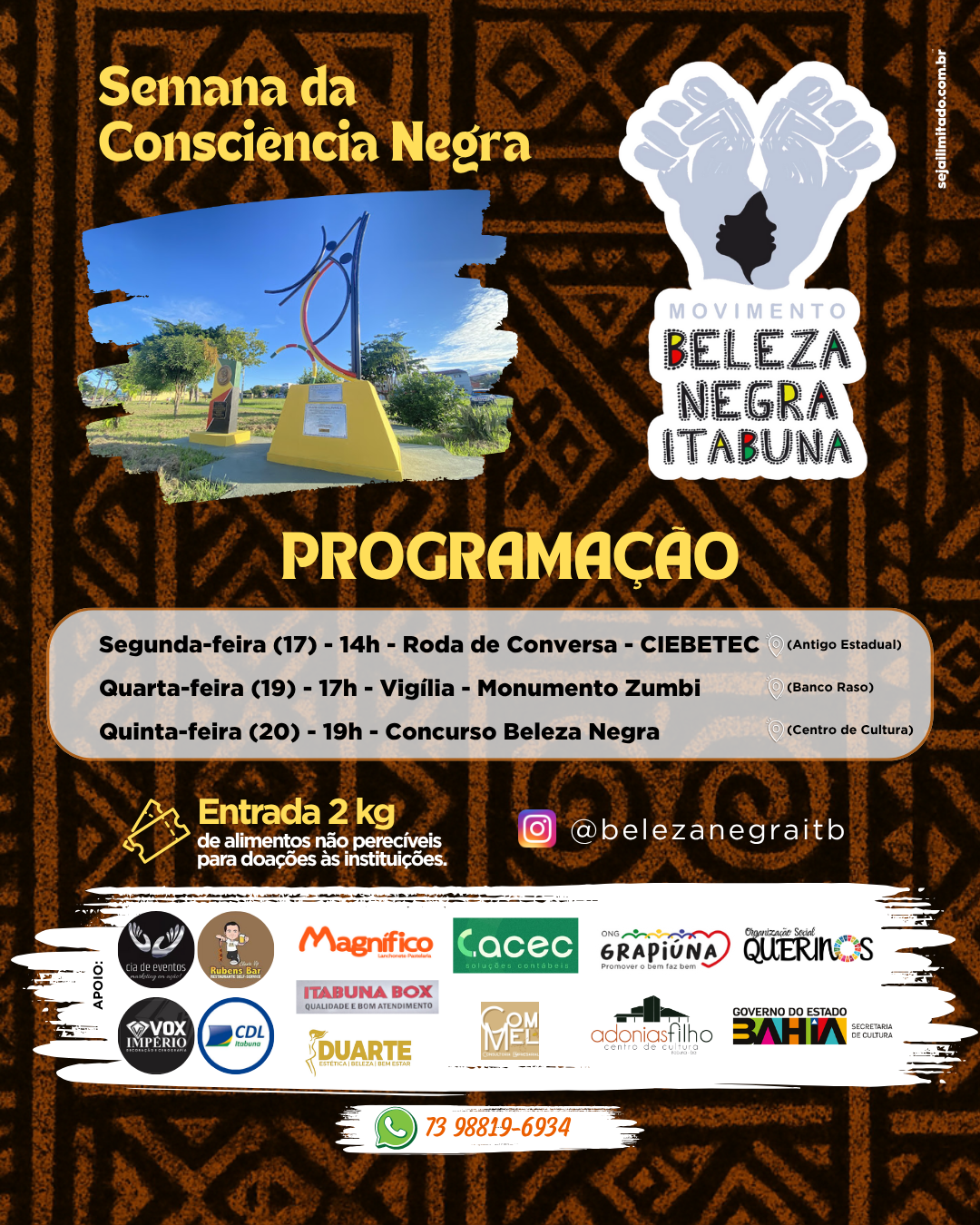 O Movimento Beleza Negra Itabuna convida a população para uma programação especial em comemoração à Semana da Consciência Negra, com atividades culturais, reflexão e celebração da cultura afro-brasileira. As ações foram pensadas para valorizar saberes, histórias e práticas de jovens e lideranças negras da região, além de ampliar o diálogo sobre igualdade, respeito e memória histórica.